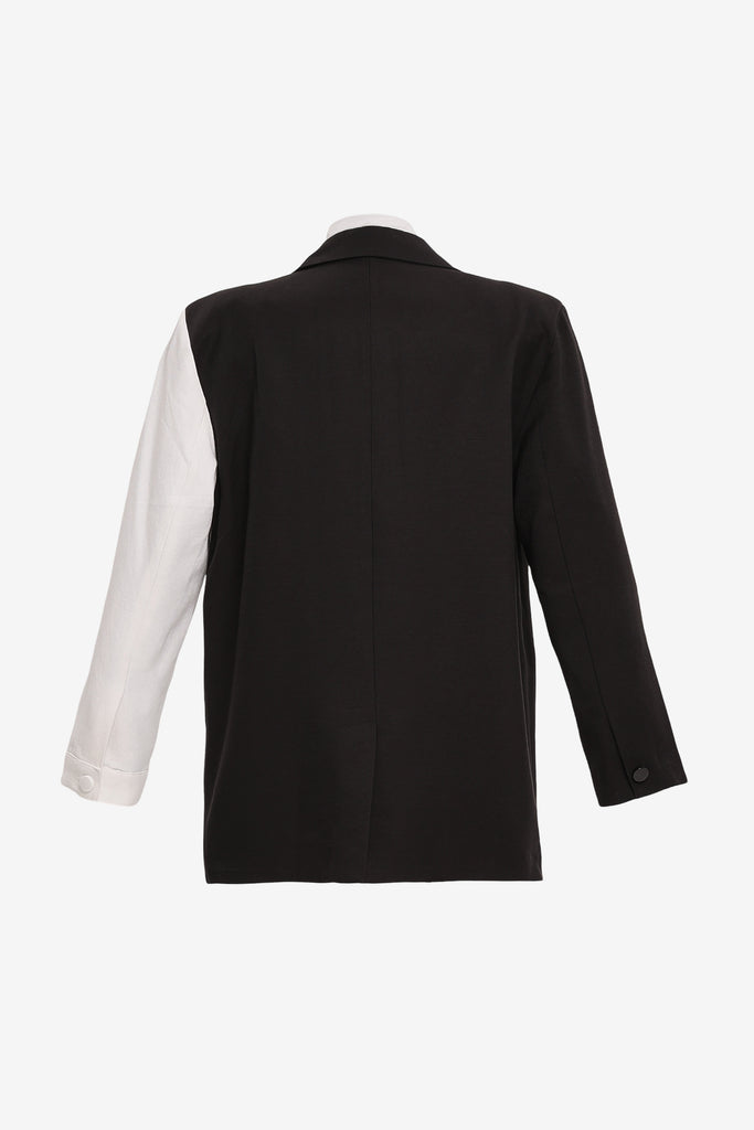 Spedizione gratuita per ordini superiori ai 150 euroUn capo sofisticato e di grande impatto visivo, questo blazer bicolor unisce eleganza e modernità in un unico pezzo statement. La sua particolarità risiede nel contrasto cromatico tra il nero e il bianco, che divide il design con un effetto asimmetrico originale e di tendenza.