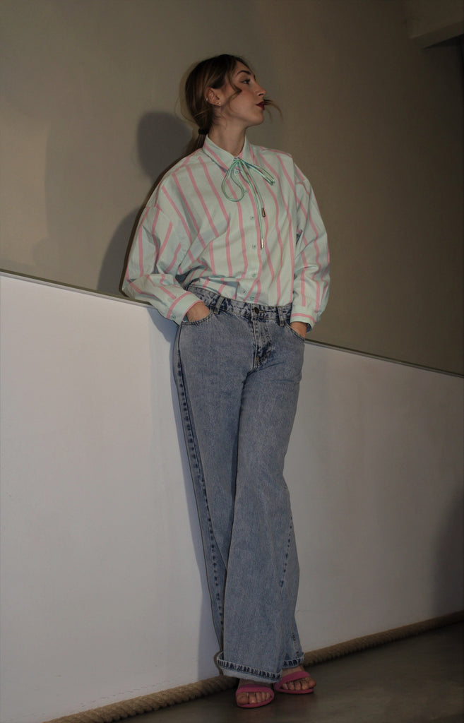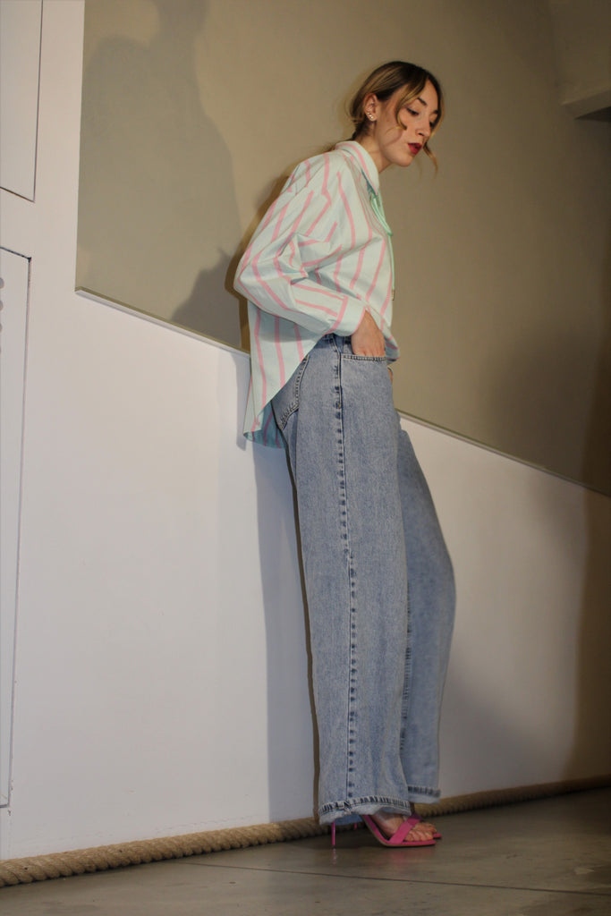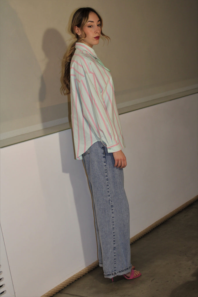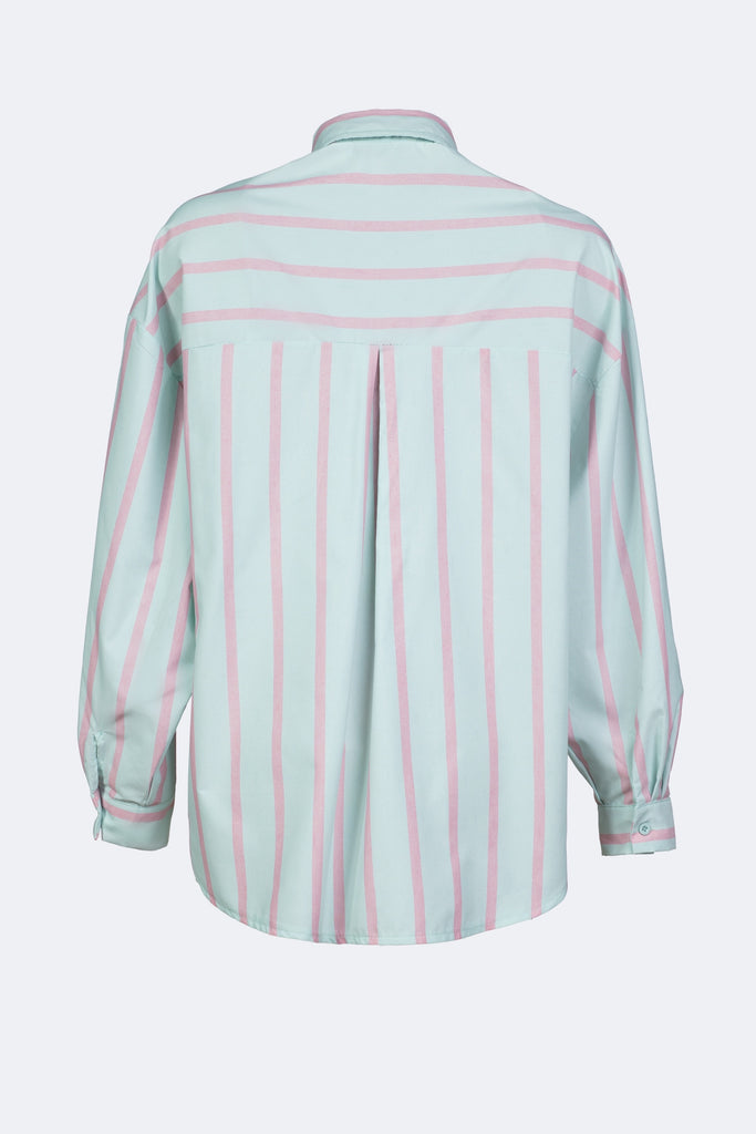 Spedizione gratuita per ordini superiori ai 150 euroCamicia over size base tiffany e riga rosa con cordoncino abbinato