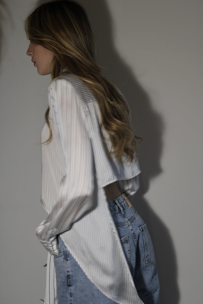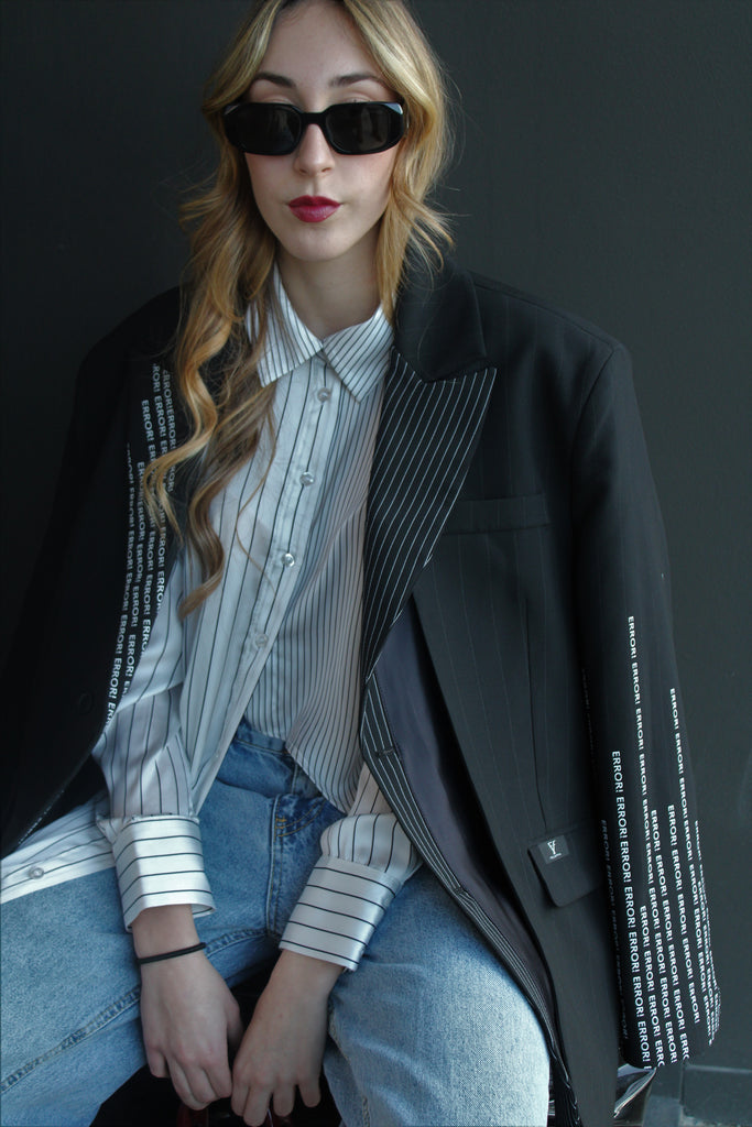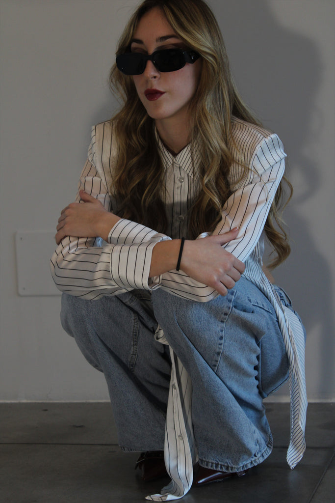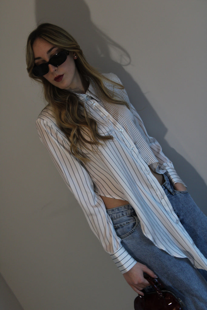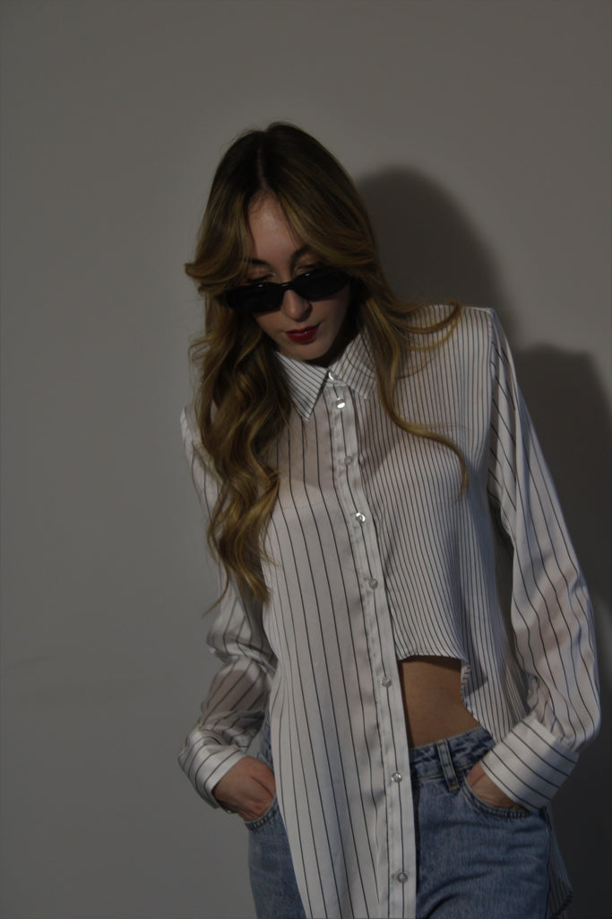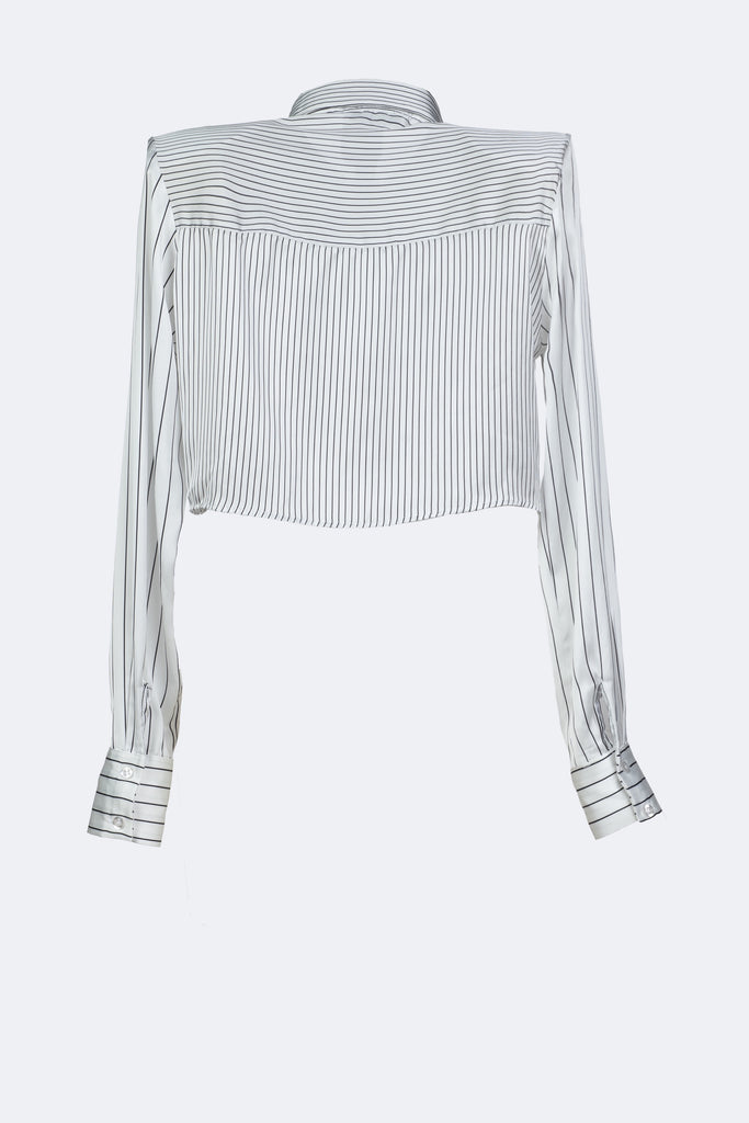 Spedizione gratuita per ordini superiori ai 150 euroCamicia corta bianca a righe nere di spessori diverse. Effetto lucido elegant chic.