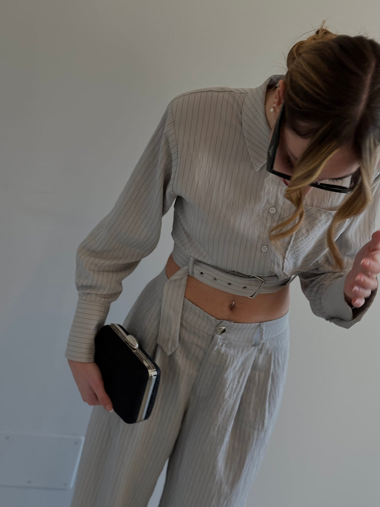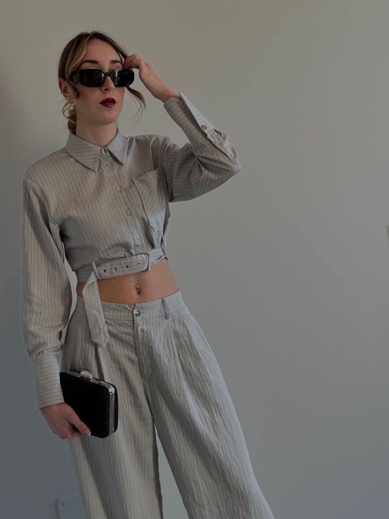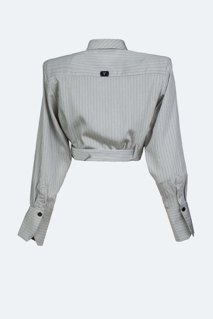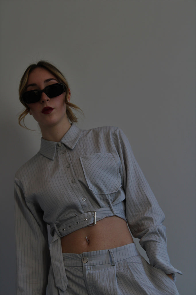 Spedizione gratuita per ordini superiori ai 150 euroCamicia stampa gessata su base grigia con cinta in vita