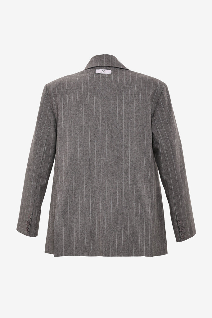 Questo blazer doppiopetto a righe sottili gioca con le texture e le direzioni del pattern per un effetto dinamico e sofisticato.