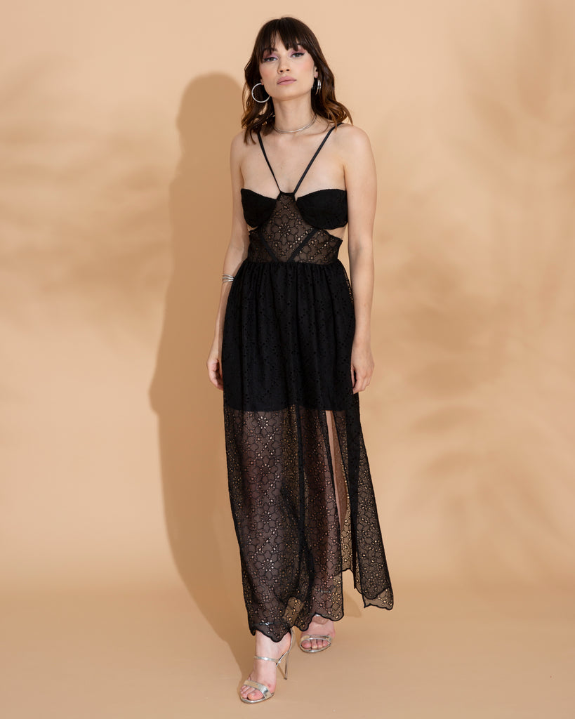 IBISCO - Abito lungo in pizzo sangallo con gonna svasata.