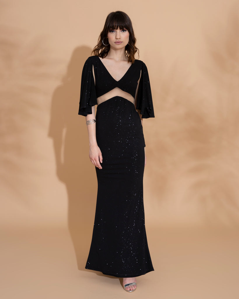 Spedizione gratuita per ordini superiori ai 150 euroAbito lungo in maglina glitter con maniche e taglio rivestito in tulle nude in vita.