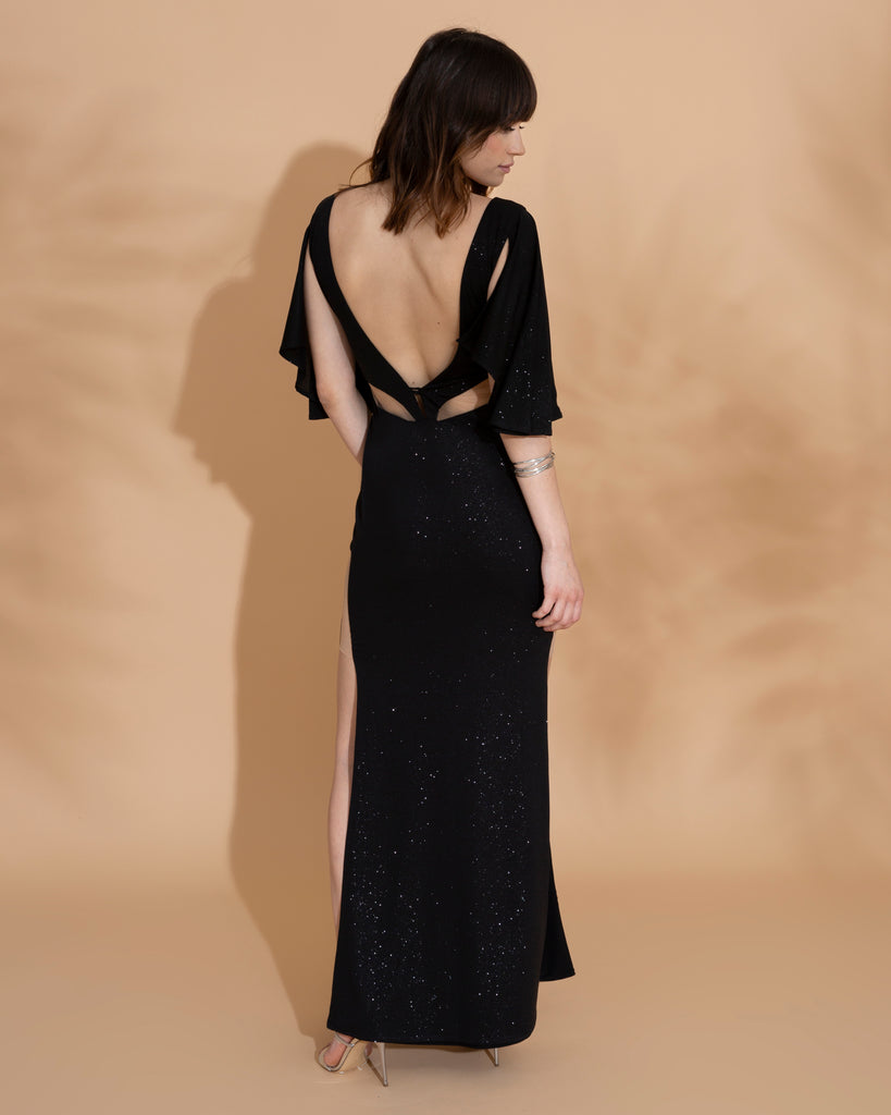 Splendi con raffinata eleganza indossando Campanula, un abito lungo senza tempo dalla silhouette sinuosa in maglina glitter. Il taglio, rivestito in tulle nude in vita, aggiunge un tocco di delicatezza e raffinatezza, creando un contrasto affascinante con il luccichio del tessuto.