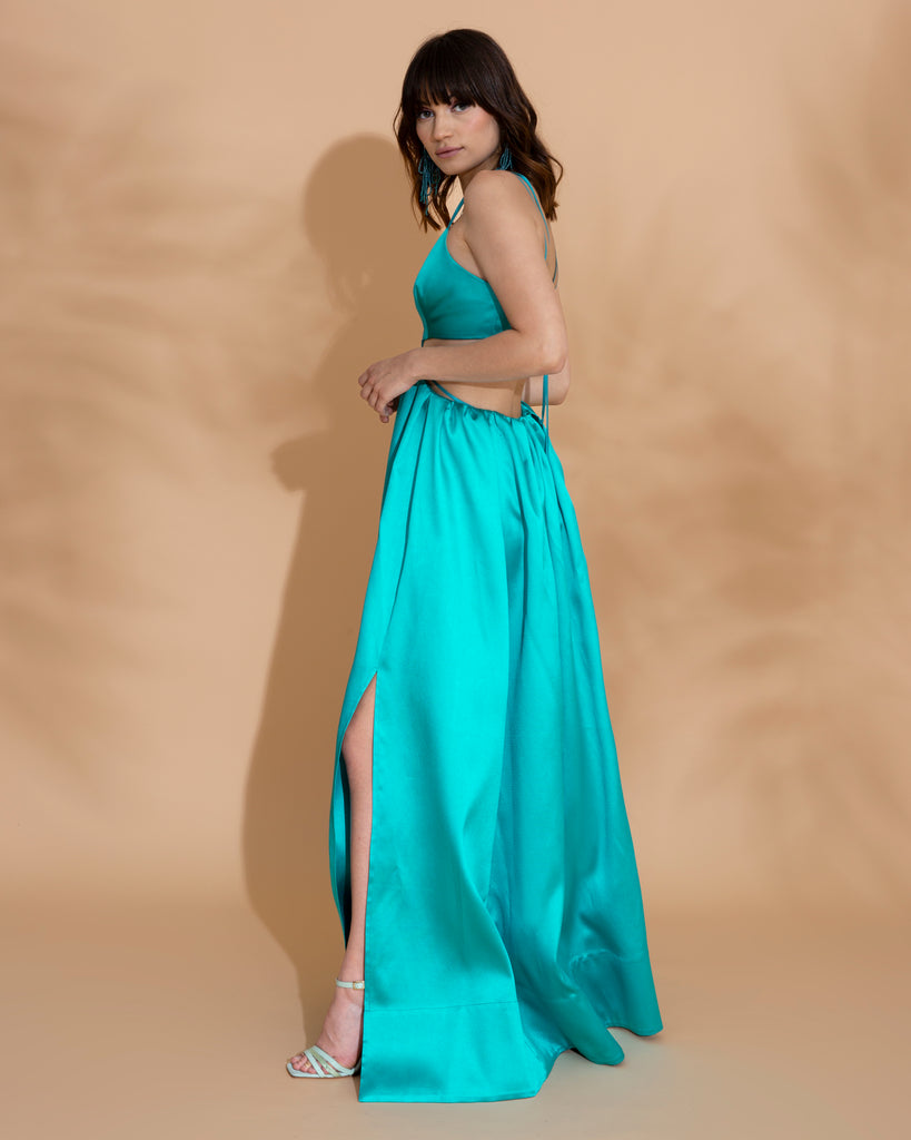 CALENDULA - Abito lungo in mikado con scollo a V.